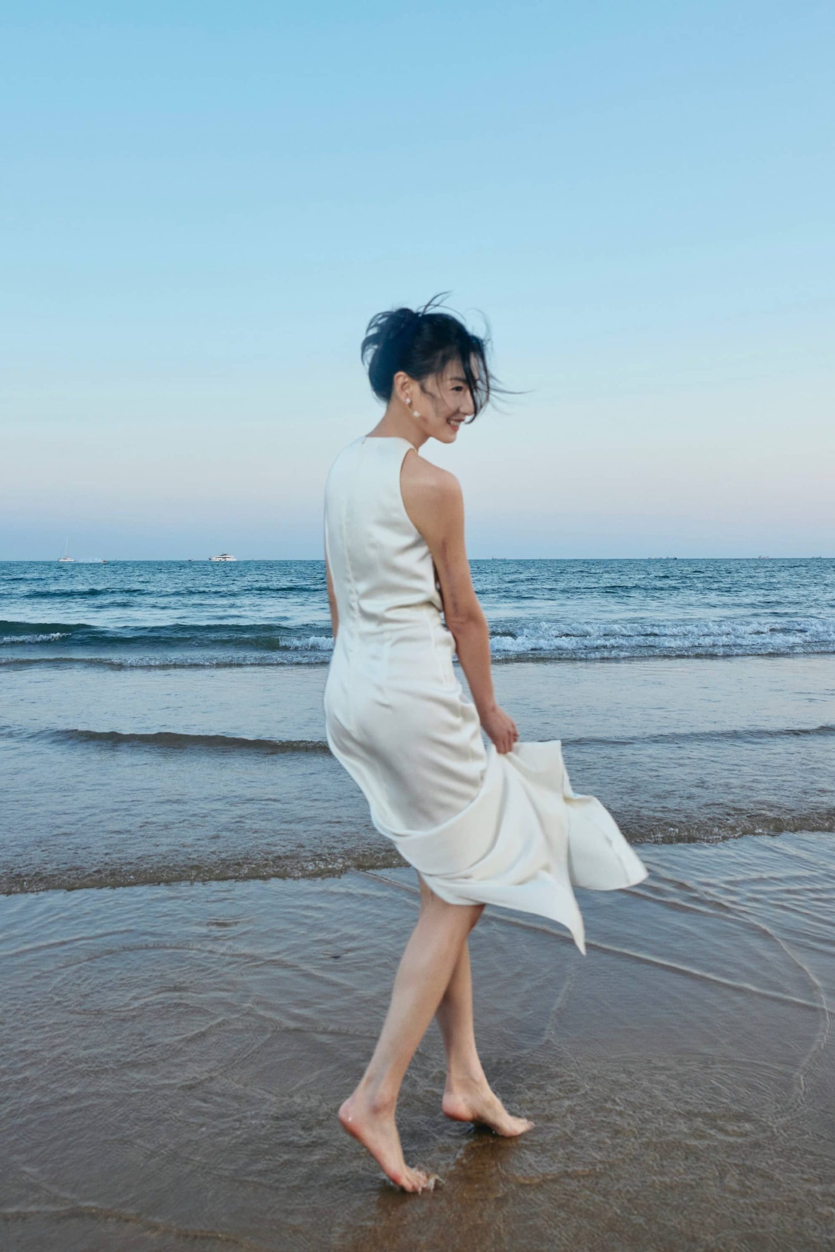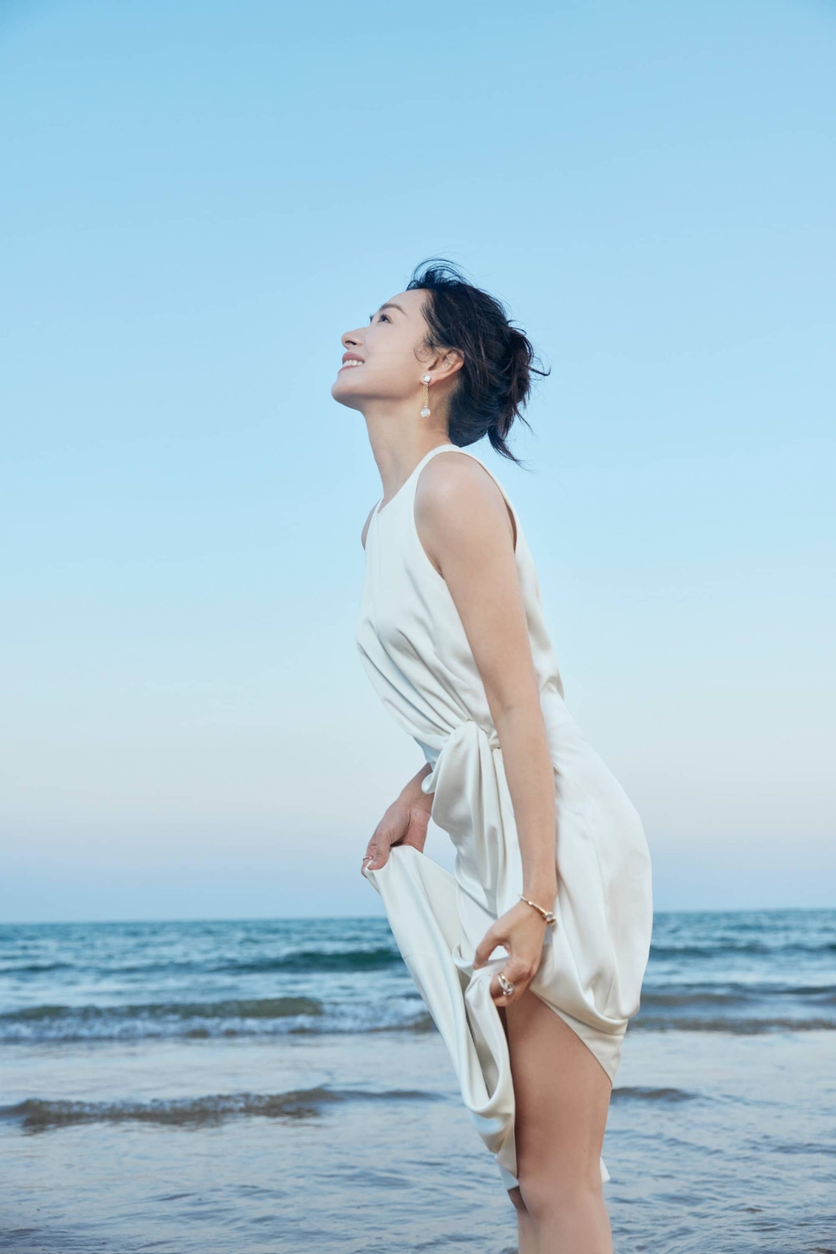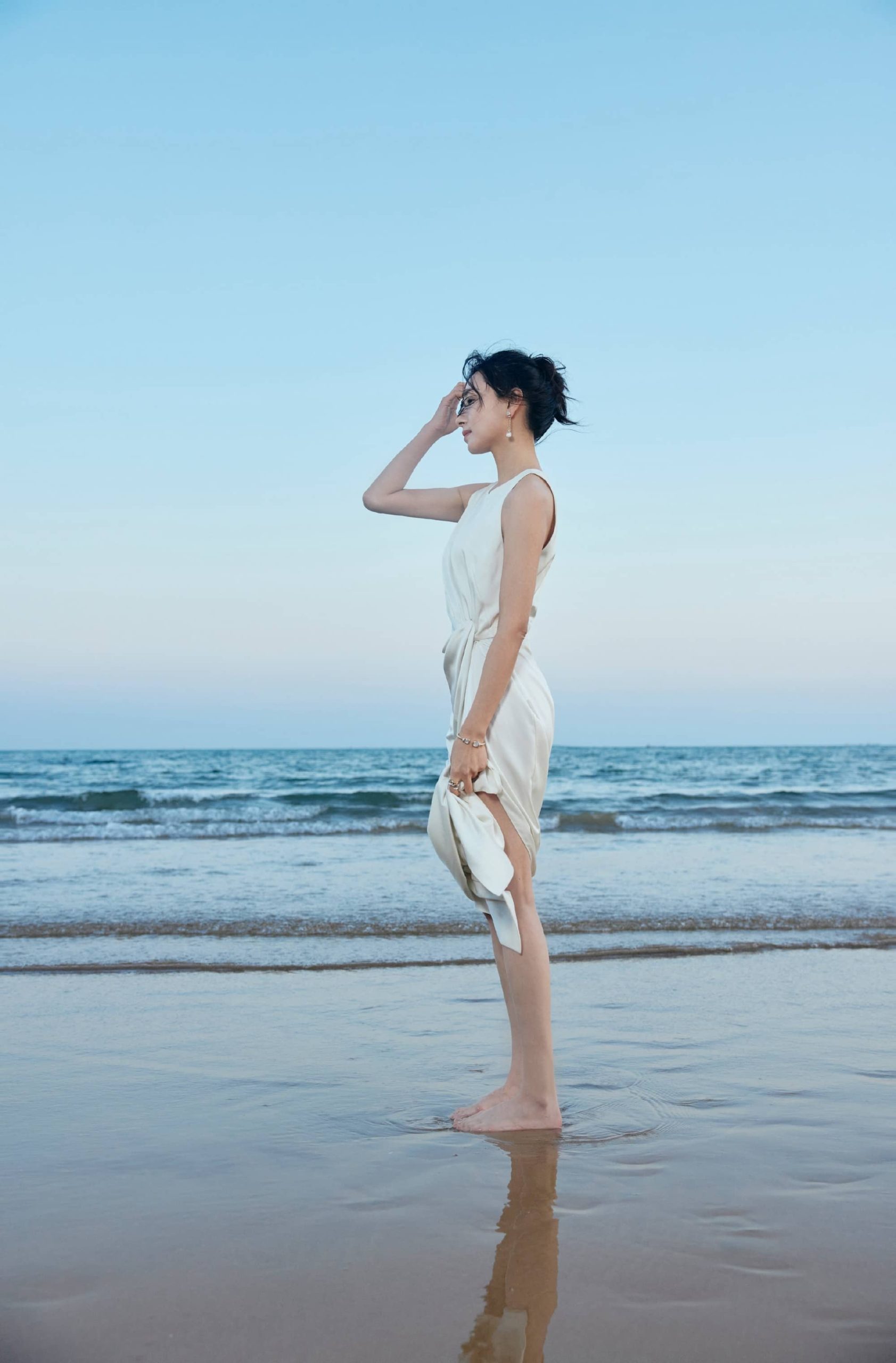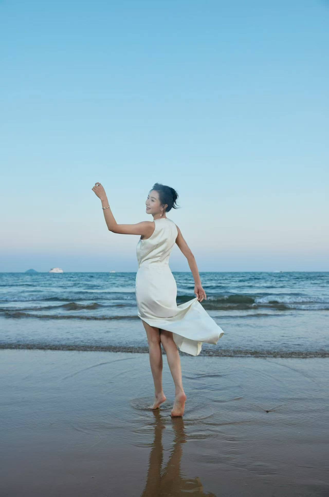 万茜海边白裙穿搭美拍,甜笑可人