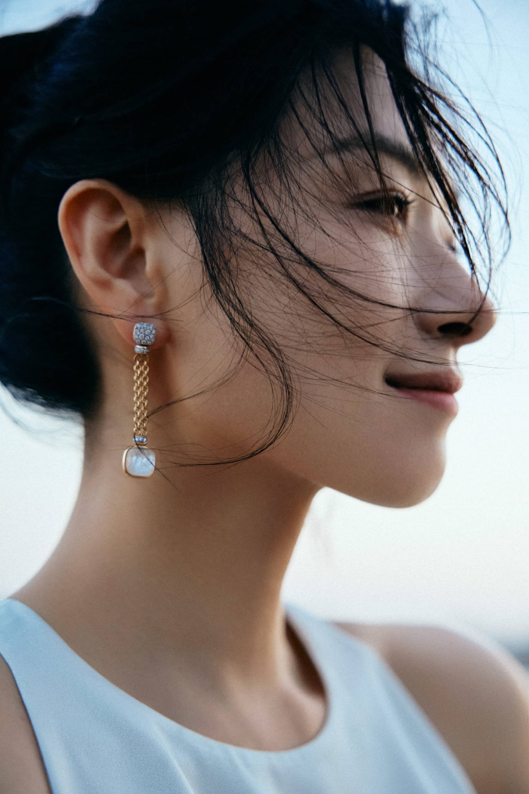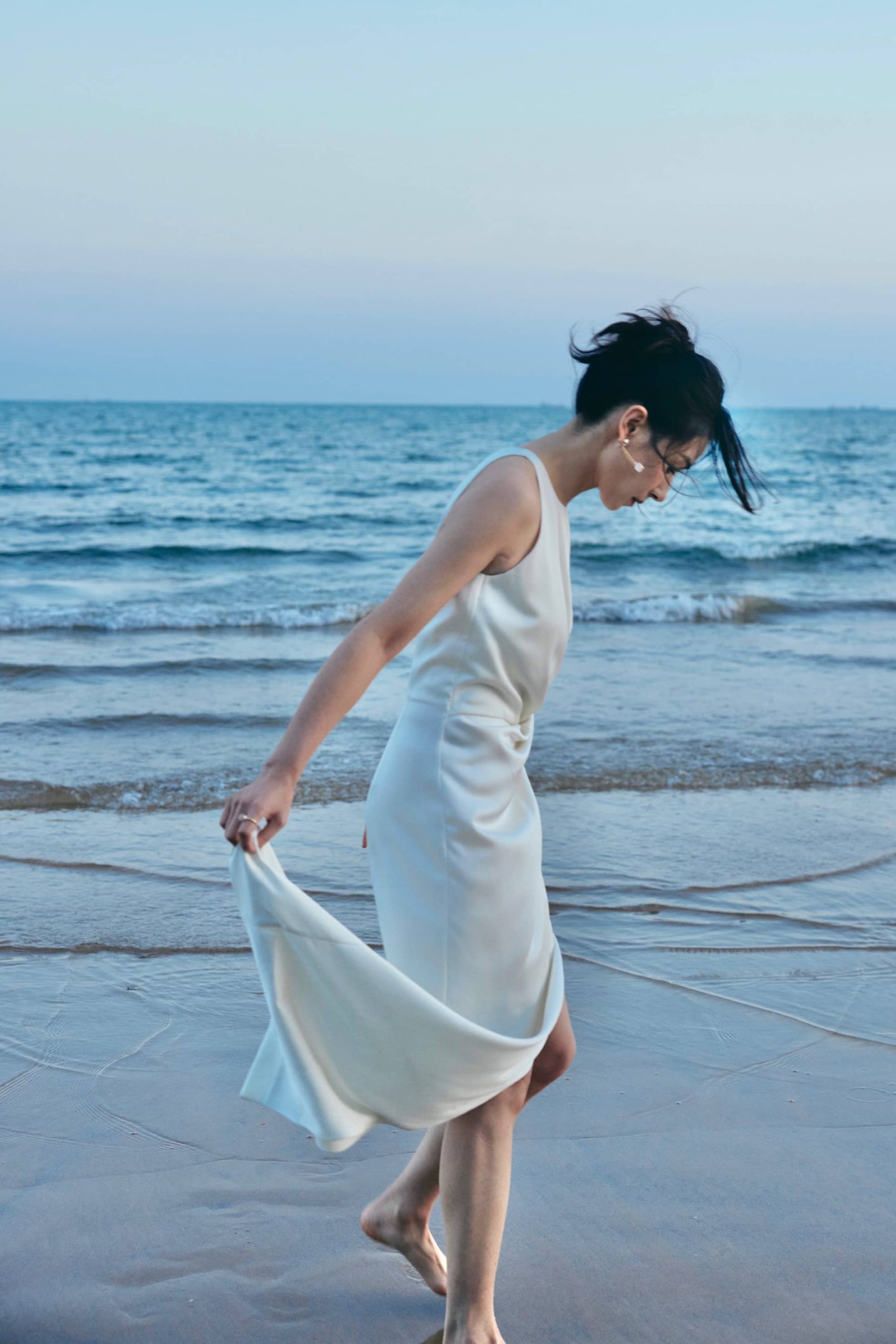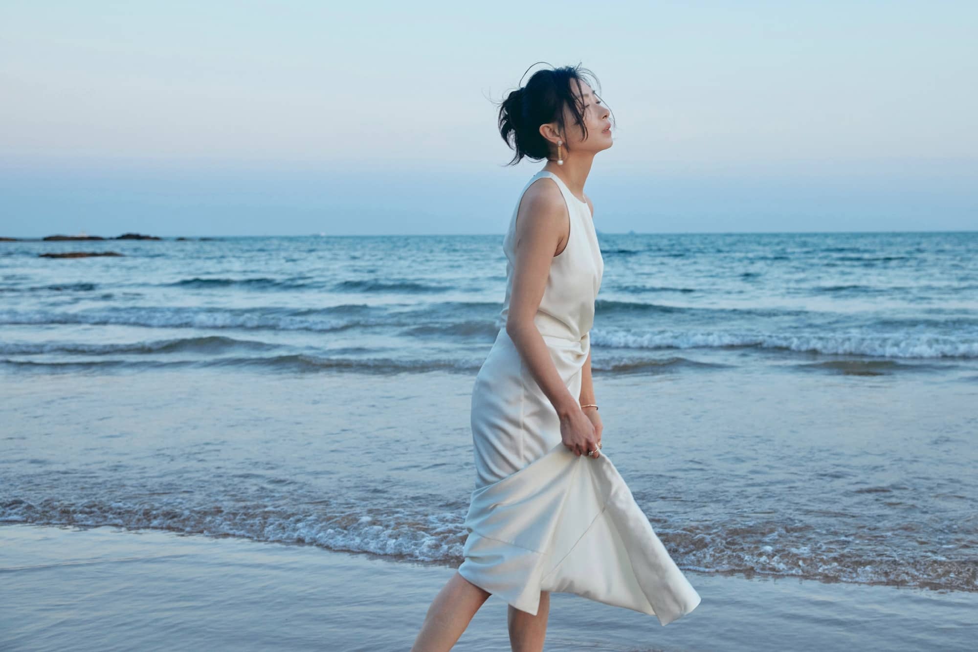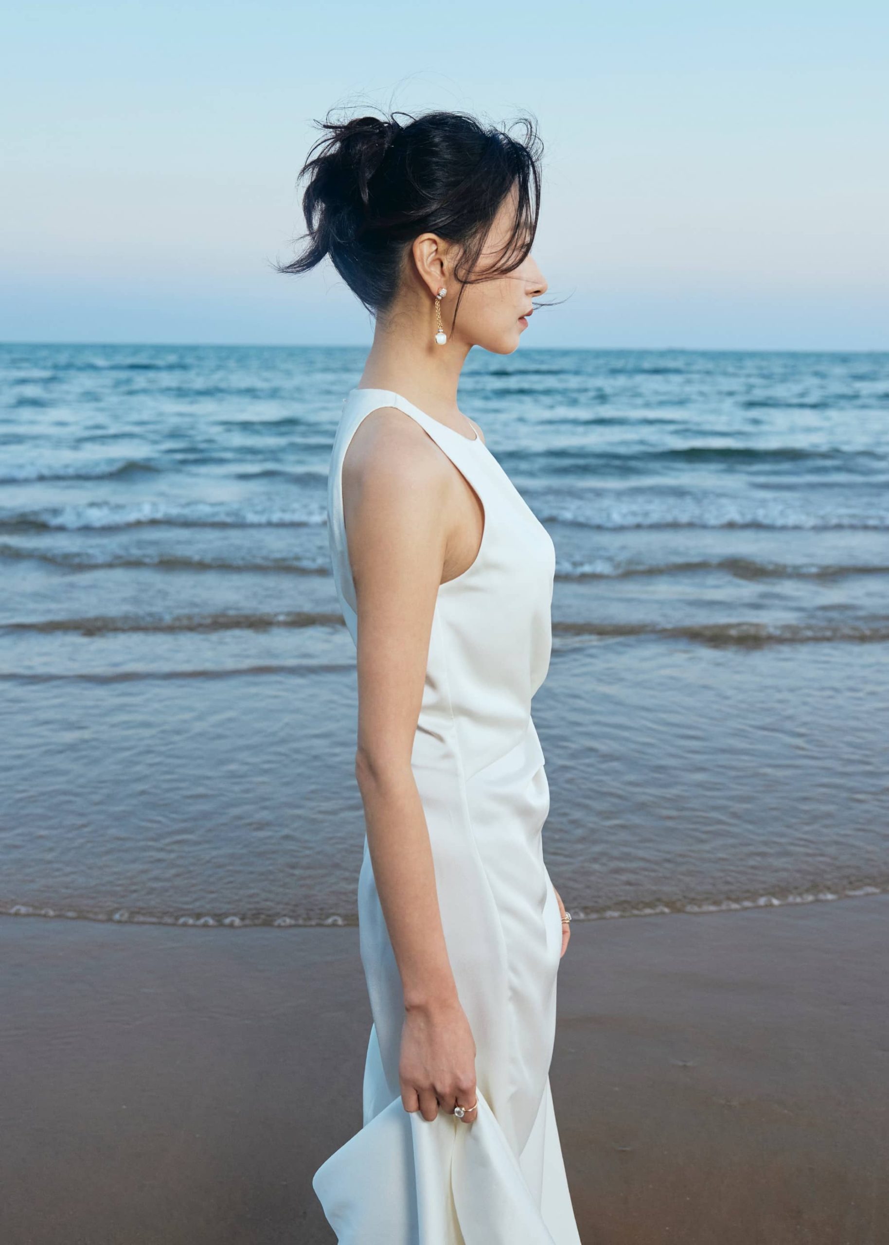 万茜海边白裙穿搭美拍,甜笑可人